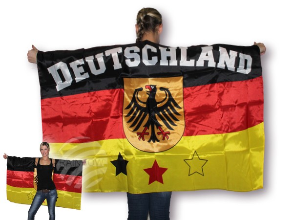 Polyester-Textil-Material, waschbar, beidseitig bedruckt, Rand ist doppelt umsäumt und an der Mastseite verstärkt mit 2 Messingösen.