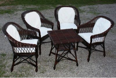 ...A set of garden furniture consists of 4 chairs with cushions and a table with a shelf under the tabletop. The furniture is painted in the color of Wenge. Perfect for garden, terrace and into the house.