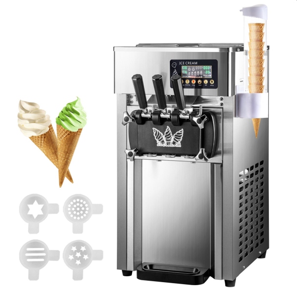 · 3 optionale Geschmacksrichtungen & 2 Trichter: Die kommerzielle Eismaschine von VEVOR ist in der Lage, stündlich bis zu 5 Gal (18 L) Eiscreme zu produzieren, und jedes Mal etwa 10 Stk. Sie ist mit zwei 0,8 Gal (3 L) Trichtern ausgestattet, die beide au