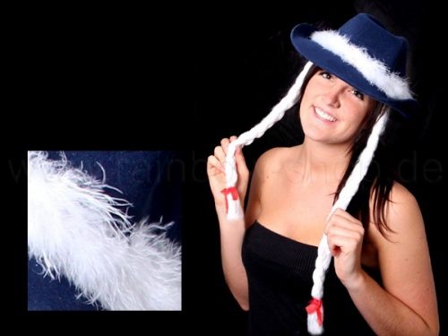 großer blauer Hut, mit langen weissen Zöpfen