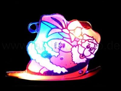 ...On the back of a small magnet to the Blinky to be attached to objects (clothing, including jackets, shirts, t-shirts, shoes ... or body parts such as hair, nose, lips, ears ...). Additionally, one can Blinky with a safety pin as a brooch attached. ...