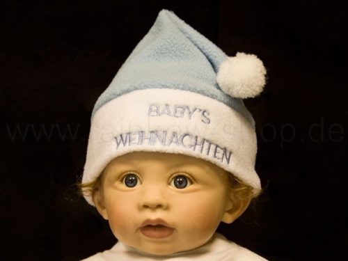 hellblau/weiss, mit Schriftzug, Bommel, Umfang 43 cm
